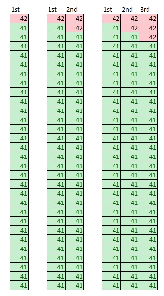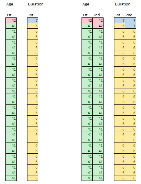 From here, we can observe arithmetic series for Age 42 occurrences based on decrement day. We summarise this in the table below, generalised using age x-1 and x.